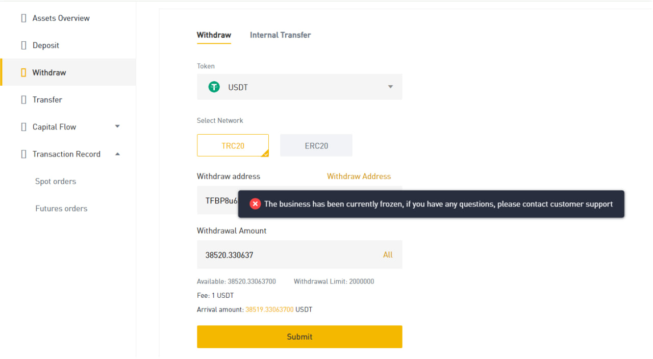 다음날쯤 출금하려고 하니 아래처럼 출금이 정지되었다는 표시가 떴습니다.